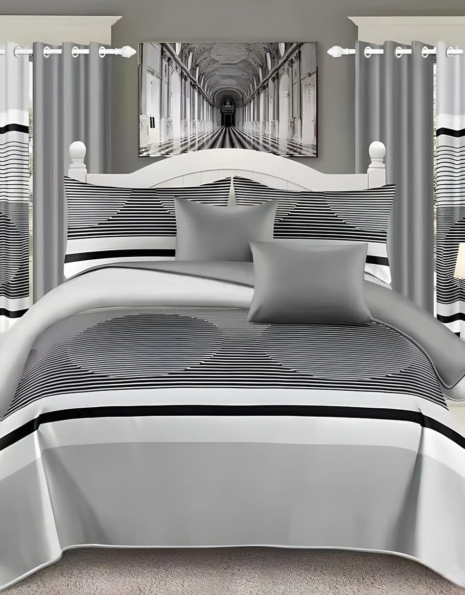 Ash And white Modern All-Season Bedding Set – 10pcs & 8pcs, 100% Cotton, Soft & Lightweight, Includes Pillow Covers & Stylish Curtains