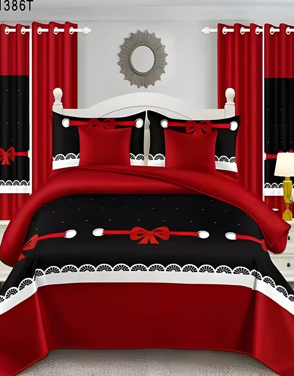 Red & Black Modern All-Season Bedding Set – 10pcs & 8pcs, 100% Cotton, Soft & Lightweight, Includes Pillow Covers & Stylish Curtains Red & Black Modern All-Season Bedding Set – 10pcs & 8pcs, 100% Cotton, Soft & Lightweight, Includes Pillow Covers & Stylish Curtains
