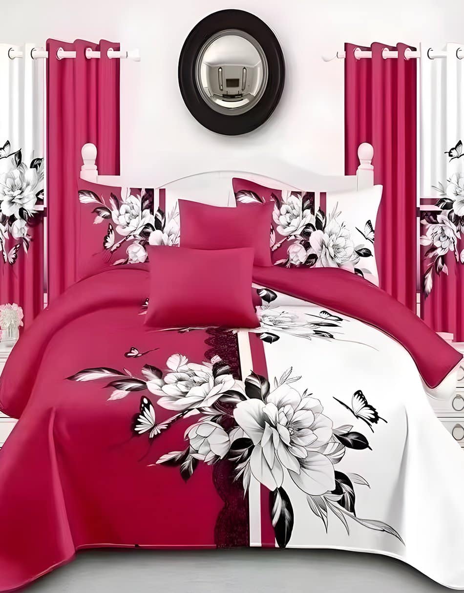 Magenta & White Modern All-Season Bedding Set – 10pcs & 8pcs, 100% Cotton, Soft & Lightweight, Includes Pillow Covers & Stylish Curtains Magenta & White Modern All-Season Bedding Set – 10pcs & 8pcs, 100% Cotton, Soft & Lightweight, Includes Pillow Covers & Stylish Curtains